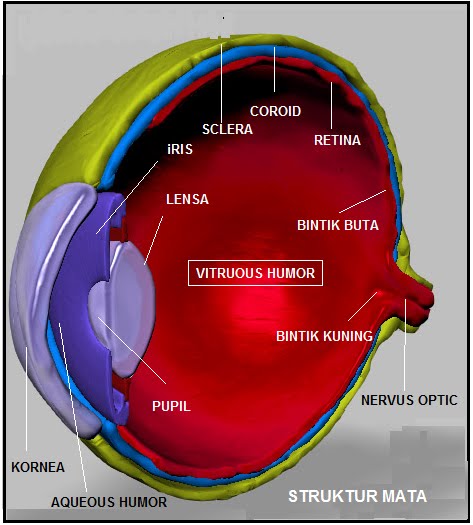 • Humor vitreus : gel transparan yang terdapat di belakang lensa dan di depan retina (mengisi segmen posterior mata).